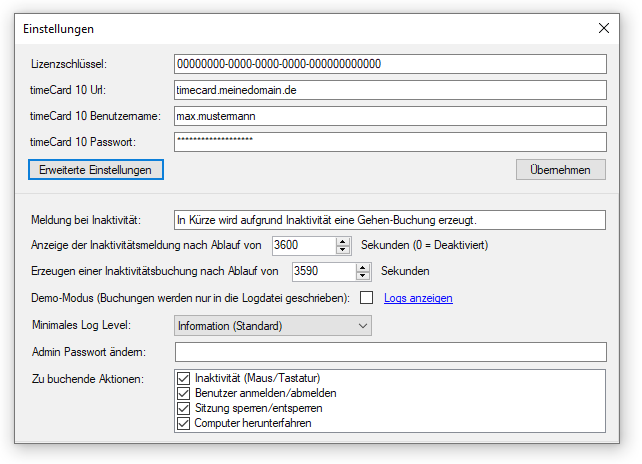 Das SmartActivity Addon erkennt automatisch diese Aktivitäten, wie Logoff (Abmelden), Lock (Sperren), Shutdown (Herunterfahren), Hibernate (Ruhezustand), Suspend (Schlafmodus/Stand-By), Wake-Up (aus Suspend oder Hibernate), Unlock (Entsperren) und Logon (Anmelden), und führt entsprechend eine Kommen- oder Gehen-Buchung in der Zeiterfassung aus. Somit sind keine manuellen Buchungen in der timeCard mehr notwendig.
